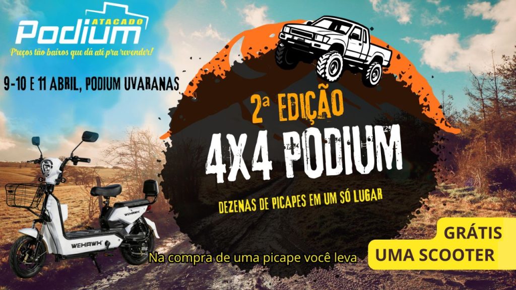 A Podium Automóveis realiza, entre os dias 9, 10 e 11 de abril, a 2ª edição do evento “4×4 Podium”, voltado à comercialização de picapes com condições especiais em Ponta Grossa. A ação acontece na unidade da empresa em Uvaranas, localizada na Av. Bpo Dom Geraldo Pellanda, 21, próximo ao chafariz, e reúne diversas opções de veículos disponíveis para negociação.