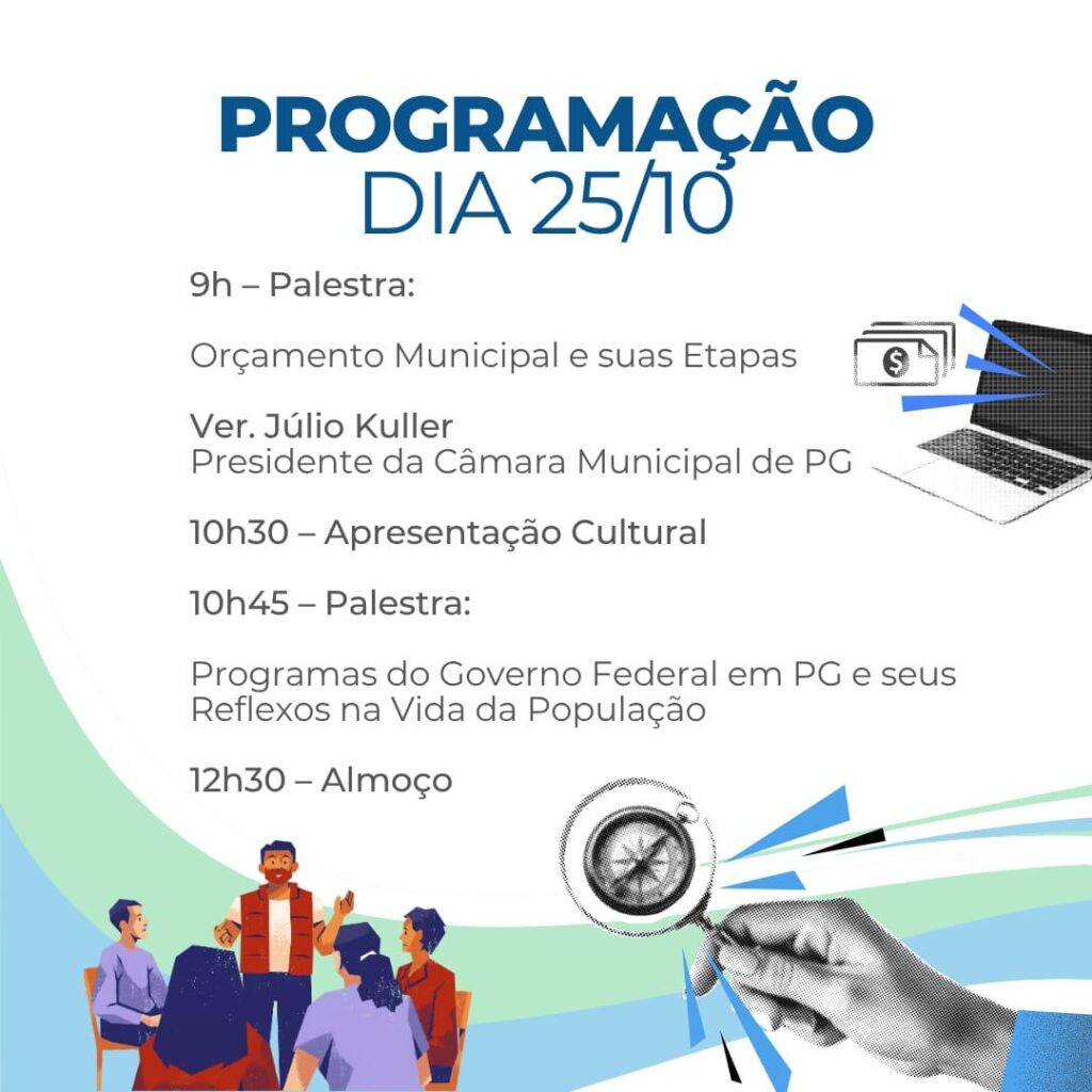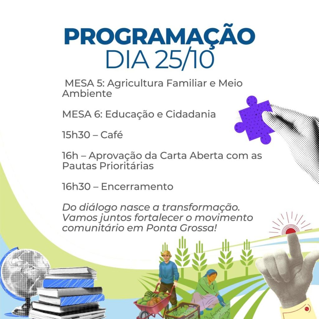 No sábado (25), as atividades começam às 9h, com a palestra do vereador Júlio Kuller, presidente da Câmara Municipal de Ponta Grossa, sobre “Orçamento Municipal e suas Etapas”. O dia também contará com debates sobre programas do Governo Federal e suas repercussões na vida da população, além de seis mesas temáticas abordando temas como moradia e autogestão, juventude e cultura no bairro, mulheres e direitos, agricultura familiar e educação cidadã. O encerramento acontece às 16h30, com a aprovação da Carta Aberta com as pautas prioritárias levantadas durante o congresso.