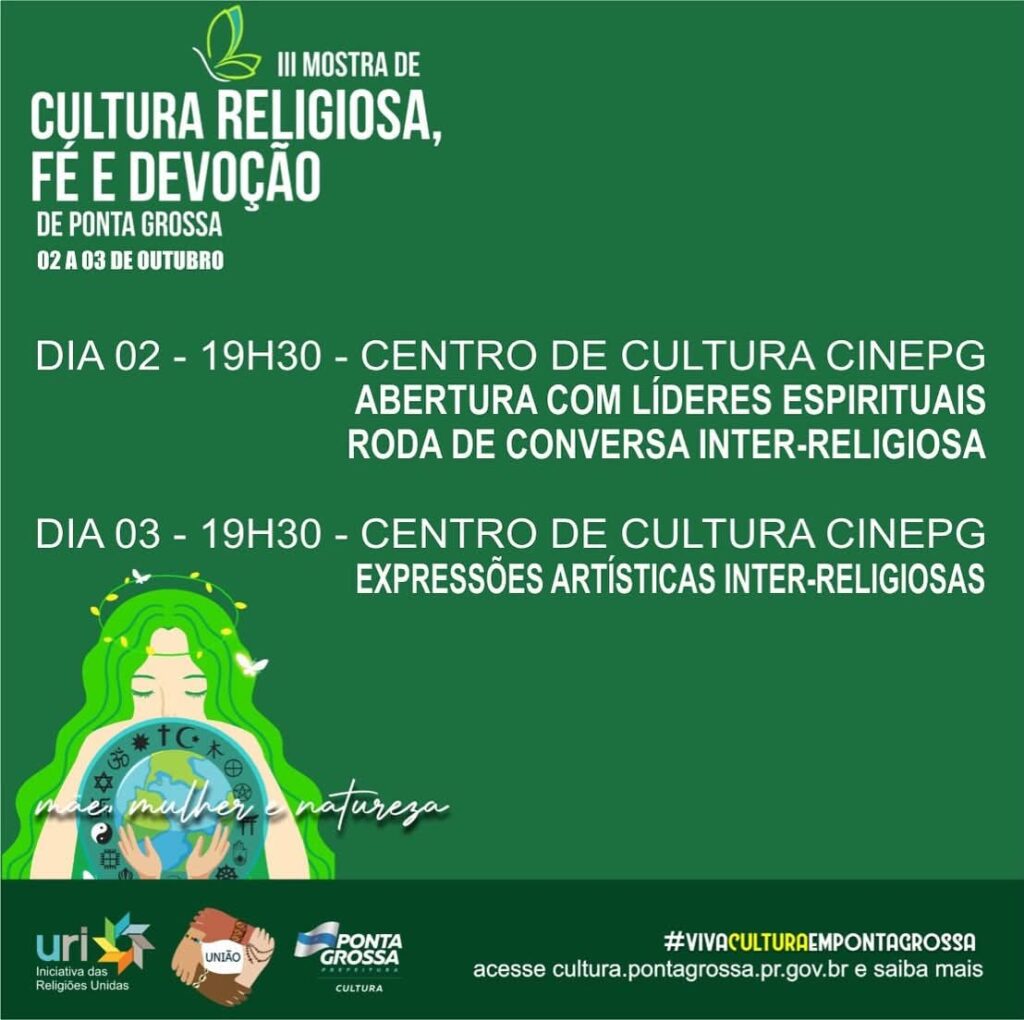 Nesta sexta-feira (03), às 19h30, ocorre a segunda noite da III Mostra de Cultura Religiosa, Fé e Devoção, no Auditório B do Teatro Ópera (Rua XV de Novembro, 468), evento que valoriza a diversidade de tradições religiosas e artísticas presentes em Ponta Grossa e região.