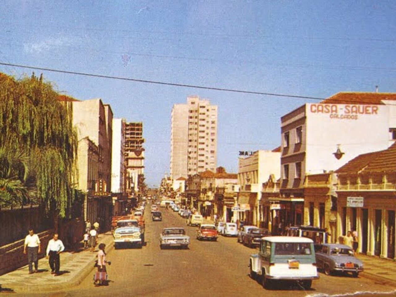 Do acervo de Eustáquio Nardini, o registro mostra a avenida Vicente Machado no ano de 1964. Ao fundo da imagem, é possível ver o tradicional Edifício Marieta, ainda em construção. Chama a atenção as cores vivas da fotografia.