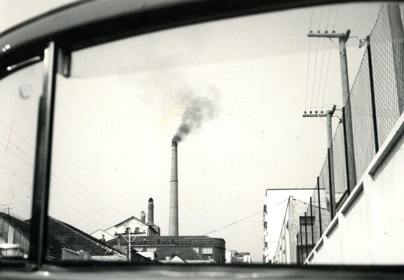 Do acervo de Museu Cenas, o registro mostra a famosa chaminé da Cervejaria Adriática de um ângulo diferente, com a fotografia tirada de dentro de um carro. Não foi possível precisar o ano da imagem.