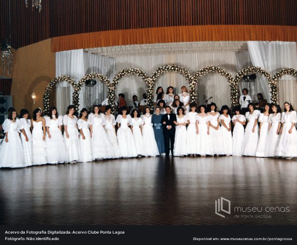 Debutantes não identificadas em encontro no salão do Clube PontaGrossense, em 1983. Ao centro, está o presidente Djalma de Almeida Cesar e esposa.
