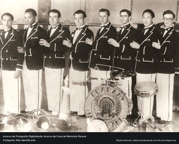Guarany Jazz Band no Clube Pontagrossense, na década de 1920. Na foto estão: Romualdo Menghini, Nequinho Ramalho, João Felipe, Vitório Santa Lúcia, Paulino Ferigoti, Jorge Klüppel, Manoel Fagundes, Emílio Voigt.