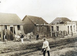 Trabalhadores da Rede Ferroviária Federal Sociedade Anônima (RFSSA), segurando o couro de uma cobra sucuri, que veio dentro de um dos vagões dos trens consertados nas Oficinas, que ficavam no bairro que leva o mesmo nome. Na imagem, estão Werner Kurt Wehrdolt (o segundo, da esquerda para direita) e ao lado dele, está Geraldo Pfeiffer. Demais pessoas, não identificadas.