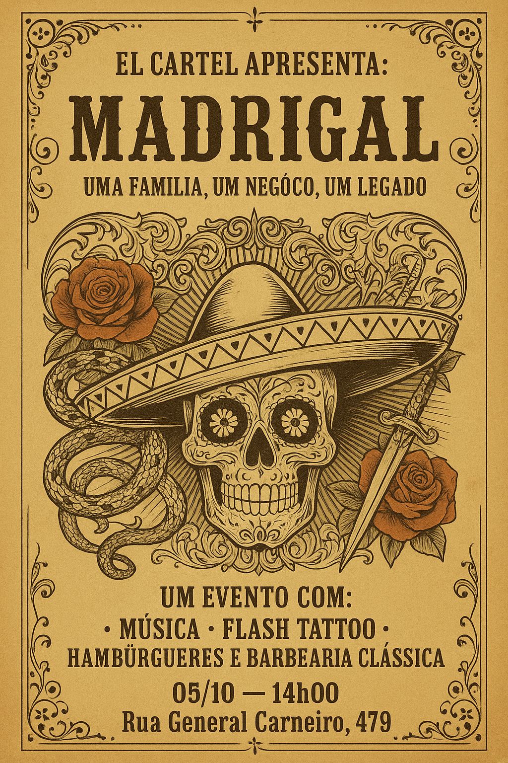 O El Cartel, espaço cultural organizado pelas empresas Barbearia Gutierrez, Gutierrez Tattoo e Hamburgueria El Forastero, promove no dia 5 de outubro o evento Madrigal – Uma Família, um Negócio, um Legado. A iniciativa busca fortalecer a cena artística local e valorizar projetos com identidade e autenticidade.
