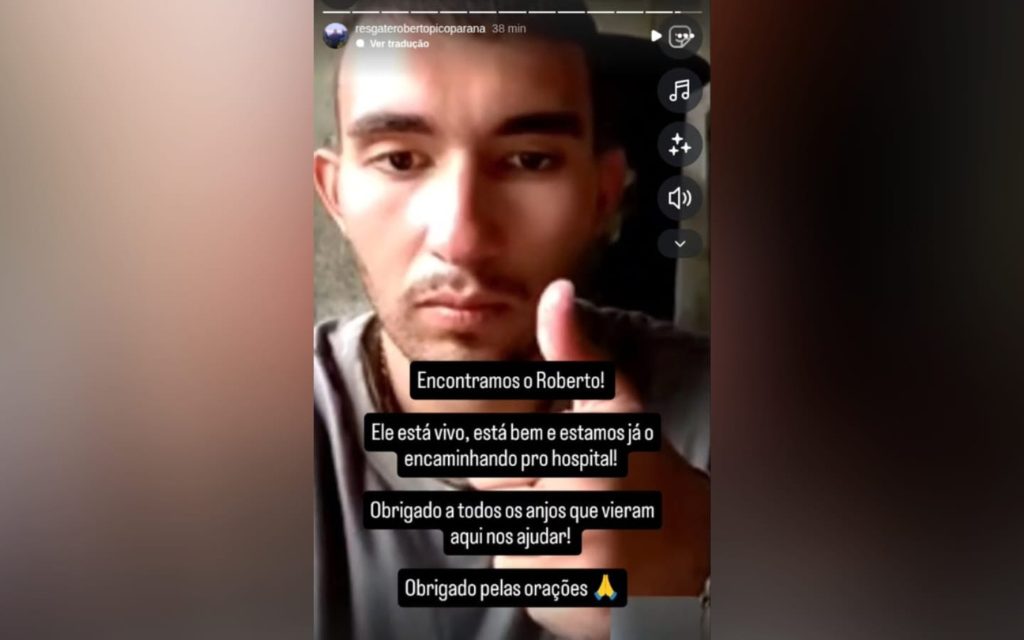 A publicação foi feita no perfil oficial de resgate da família, utilizado desde o início das buscas para atualização das informações. No vídeo, Roberto tranquiliza os familiares e confirma que está em segurança.