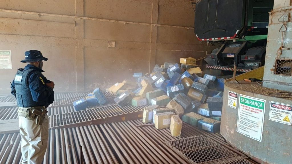 Durante fiscalização de rotina, os policiais abordaram uma carreta que transportava grãos oriundos do Mato Grosso do Sul. Ao realizarem uma vistoria minuciosa no compartimento de carga, a equipe localizou diversos fardos de maconha ocultos sob a soja.
