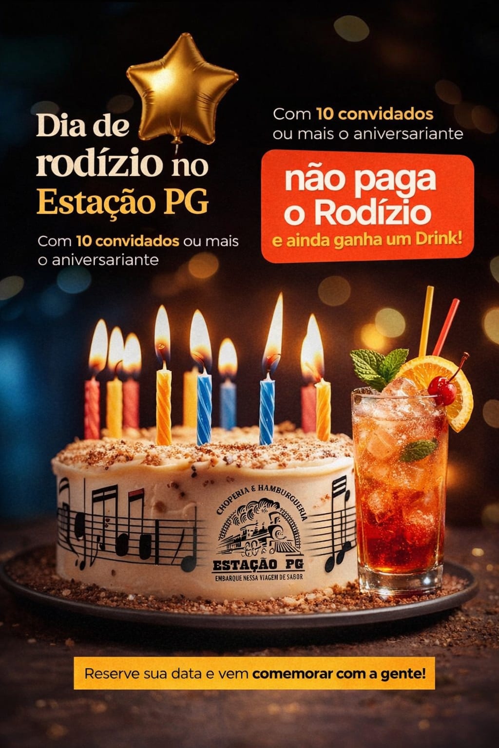Como diferencial, o Estação PG está oferecendo cortesia especial para aniversariantes: quem reunir 10 convidados ou mais não paga o rodízio e recebe um drink para celebrar. A proposta busca incentivar comemorações em grupo em um ambiente familiar ao público que frequenta a casa.