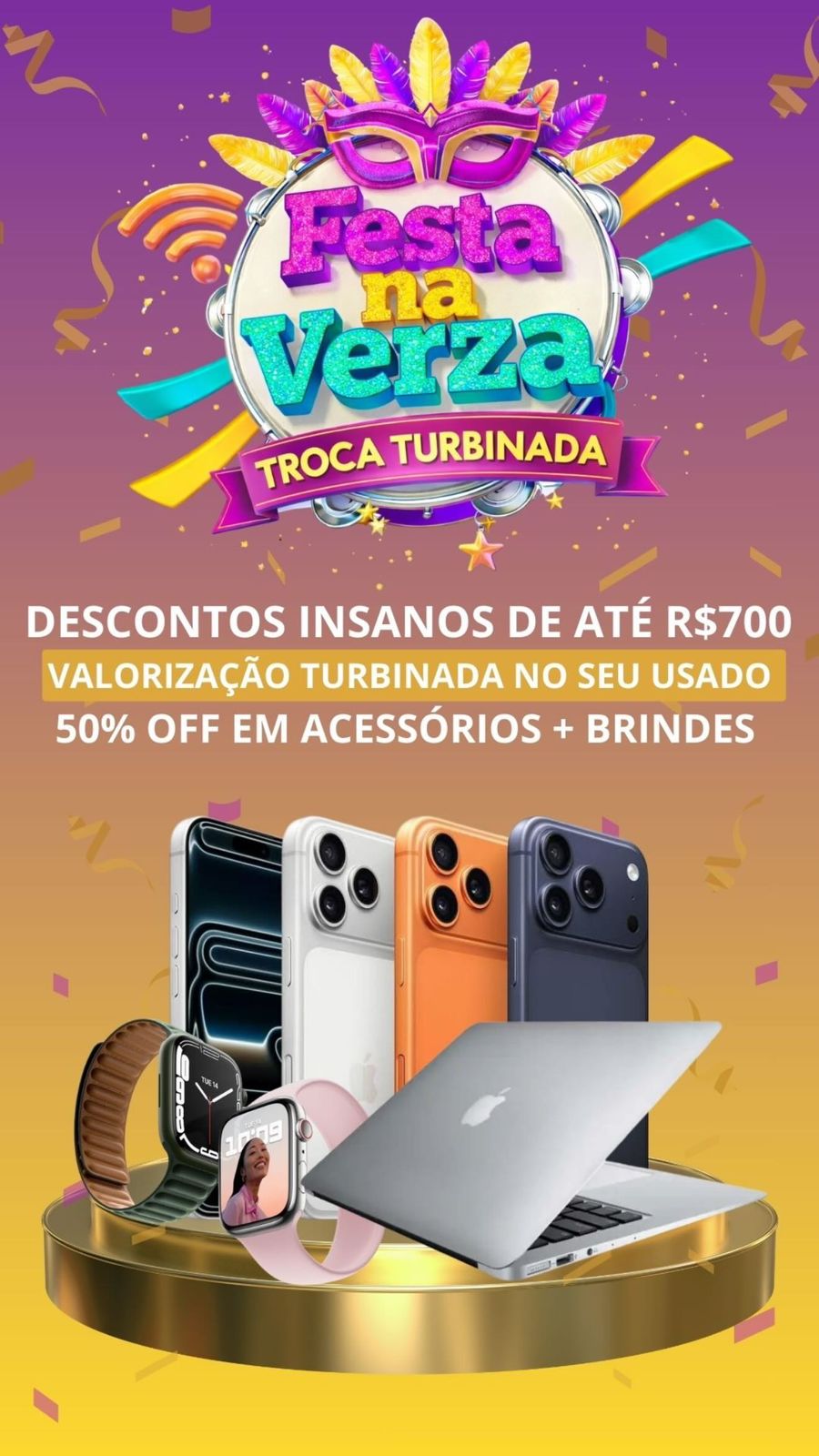 A dinâmica é simples: o cliente leva o aparelho antigo até a loja, a equipe realiza uma avaliação na hora e apresenta uma proposta com valorização turbinada na troca. Além disso, a campanha inclui descontos de até R$ 700, 50% off em acessórios e brindes exclusivos para quem fechar negócio.