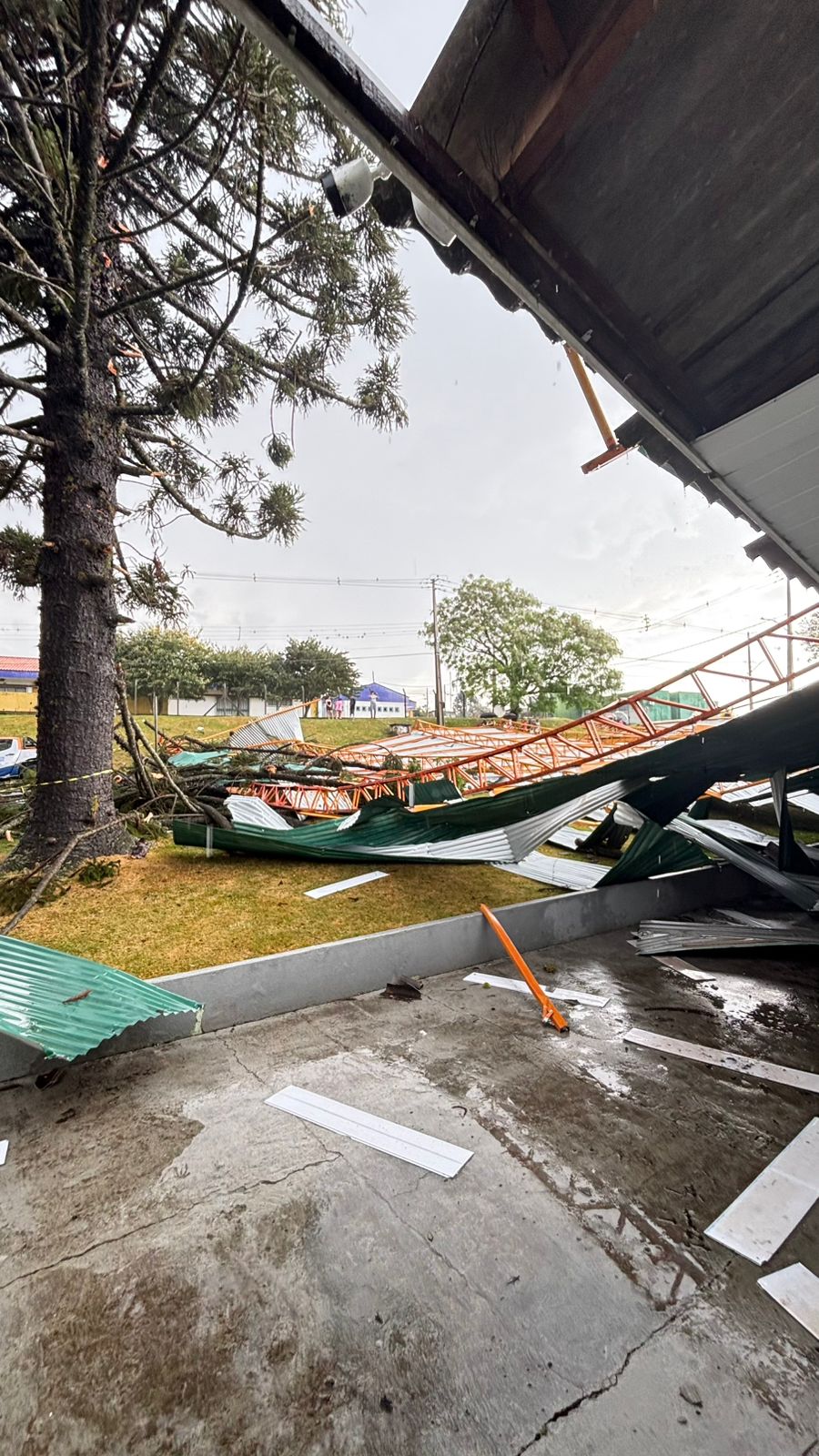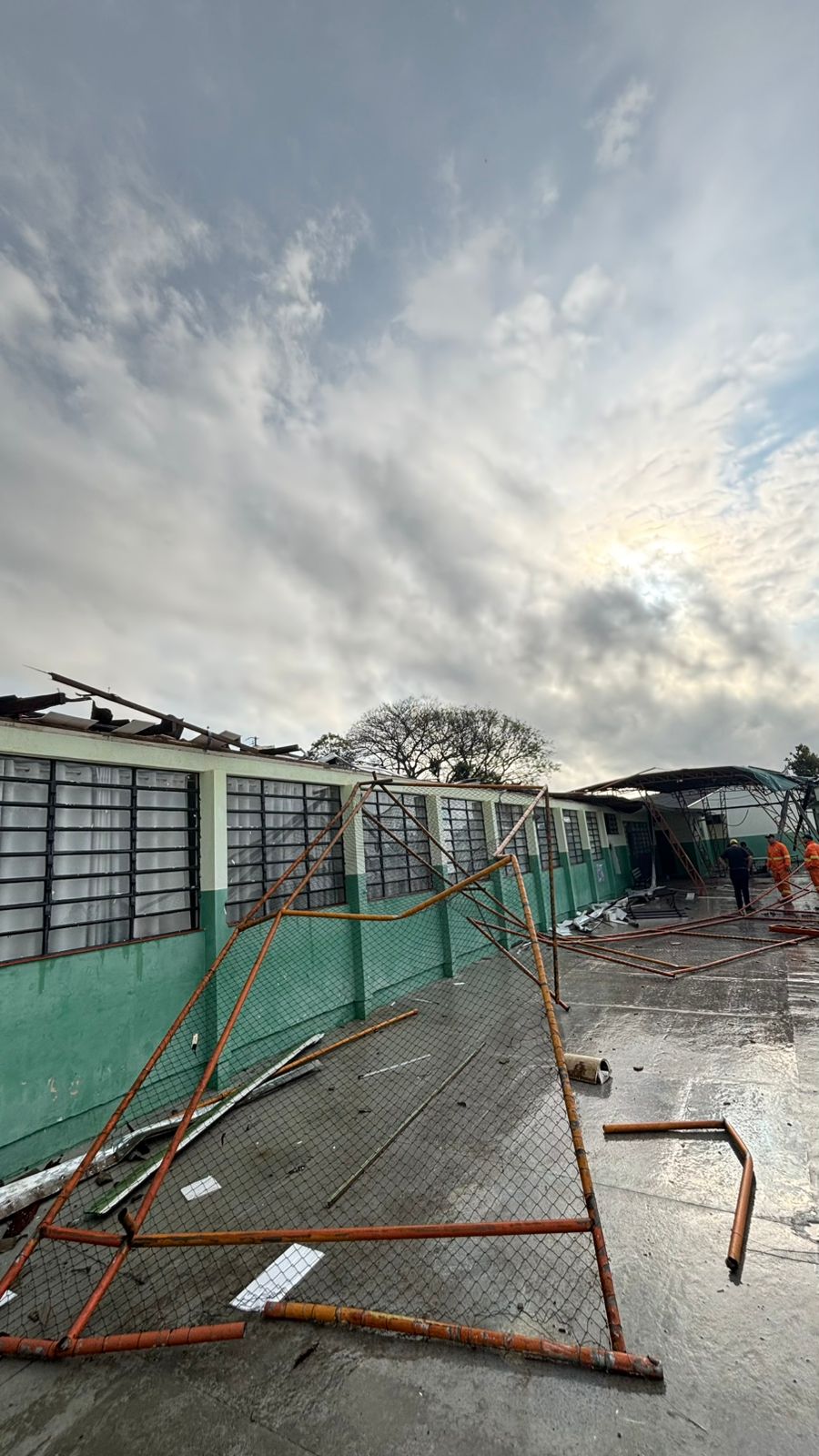 Entre os locais atingidos pelas fortes chuvas, está a Escola Municipal José Pinto Rosas, onde a cobertura de uma quadra de esportes desabou, causando danos no prédio. Diante disso, a Defesa Civil interditou o imóvel.